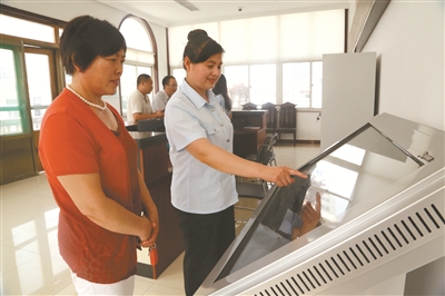 图为法庭引导员在为当事人演示如何使用自助查询系统查询案件情况。 迟 忱 摄