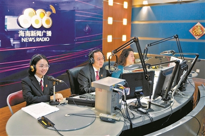 12月1日,由海南省高级人民法院和海南新闻广播联合打造的《海南法治之声》正式上线,拉开了海南法院“12·4国家宪法日”系列宣传活动的序幕。《海南法治之声》分三个板块:《一周要闻》速报海南法院一周重要新闻;《庭审现场》还原案件庭审实况;《法官在线》法官走进直播间,深度解读法治热点,积极回应社会关切。图为首期节目嘉宾、海南高院审委会专职委员皮修雁(中)和行政庭法官尹茂平(左一)与听众互动。(作者:方茜)