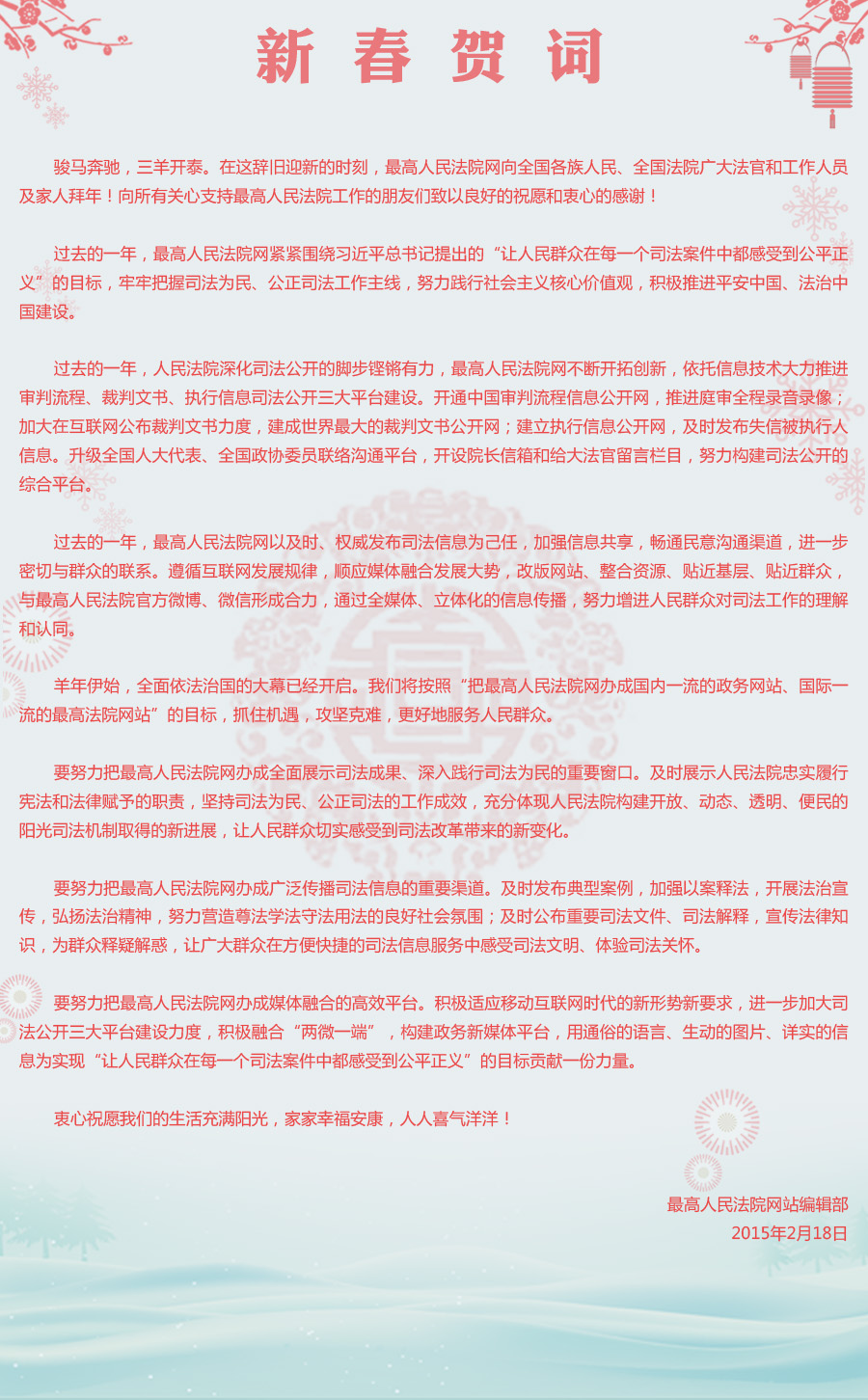 最高人民法院网向全国人民致以新春祝福