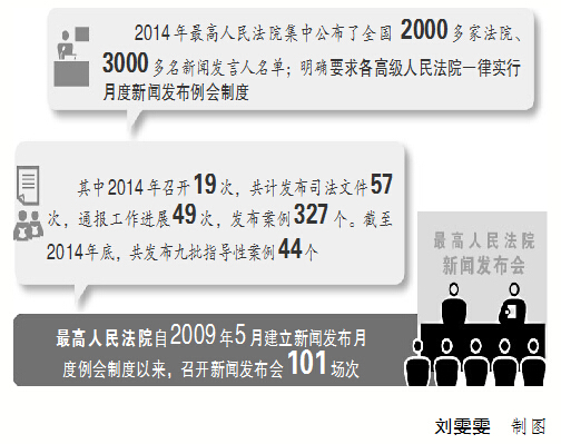 为推动各级法院做好司法信息公开工作,2014年,最高人民法院集中公布了全国2000多家法院、3000多名新闻发言人名单;制定并下发了相关意见,明确要求从今年1月1日起,各高级人民法院一律实行月度新闻发布例会制度;鼓励有条件的中级人民法院,特别是省会城市、计划单列市的中级人民法院,从明年1月1日起,实行月度新闻发布例会制度,其他中级人民法院原则上实行双月例会制度;基层人民法院立足审判实践,实行例会制度,尽可能加大发布密度和频次。(记者 马守敏)
