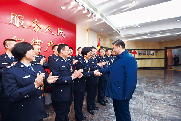 2019年2月1日,中共中央总书记、国家主席、中央军委主席习近平在北京看望慰问基层干部群众,考察北京冬奥会、冬残奥会筹办工作。这是1日上午,习近平在北京市公安局,同公安英模和干警代表一一握手,向全国广大公安干警致以新春祝福。 新华社记者 谢环驰/摄