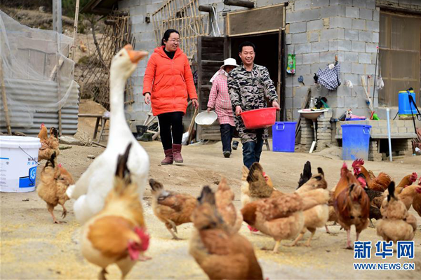 安徽省岳西县和平乡和平村第一书记、驻村扶贫工作队队长王珍(左)在贫困户开办的养鸡场里了解情况(2017年3月6日摄)。王珍2014年10月从岳西县卫计委被选派到和平村开始为期3年的驻村扶贫工作,和平村在2016年已实现贫困村出列。新华社记者刘军喜摄