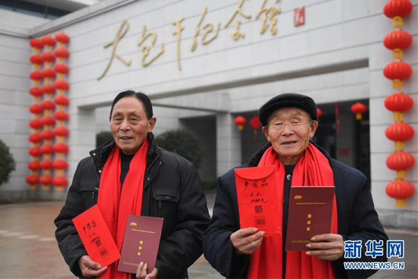 1月28日,在安徽小岗村大包干纪念馆前,“大包干”带头人严学昌(左)和严国品第二次领到集体经济收益股权分红。 新华社记者张端摄