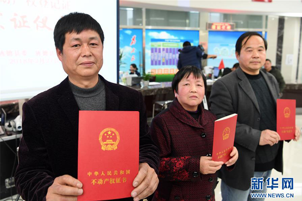 在安徽省旌德县首本农村宅基地“三权分置”不动产权登记证发证仪式上,宅基地使用权人王五四(左),宅基地资格权人方圣莲(中)和宅基地所有权人、旌德县兴隆镇大礼村民委员会代表孙秀宝展示领到的农村宅基地“三权分置”不动产权证书(2018年2月27日摄)。新华社记者刘军喜摄