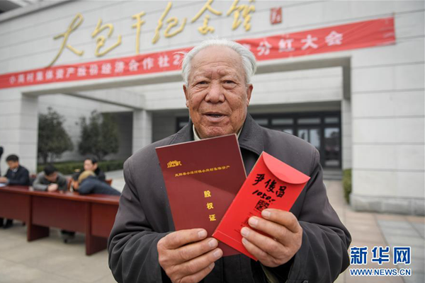 在安徽小岗村大包干纪念馆门前,“大包干”带头人严俊昌领取了第一次集体经济收益股权分红(2018年2月9日摄)。 新华社记者张端摄