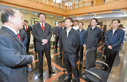 5月13日至15日,中共中央政治局委员、中央政法委书记孟建柱先后到大同、忻州、太原等地就经济发展新常态下政法综治工作进行调研。图为孟建柱在山西省高级人民法院诉讼服务中心调研。郝 帆 摄