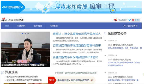 据介绍,新浪网“法院频道”主要由司法资讯、庭审视频、司法拍卖以及法院微博四个部分组成,其中庭审直播属于核心板块,它依托新浪微博司法云平台,通过法院官方微博,实现了PC端、微博客户端以及微信端的庭审视频直播。法院频道的推出也是新浪网、新浪微博服务法院工作的一次集中展现,此前已经有浙江杭州市中级人民法院、北京市海淀区人民法院、四川省成都市高新区人民法院等多家法院通过与新浪微博司法云平台的合作实现了庭审的微博直播,获得了良好的直播效果和社会效应,得到了众多网友的一致认可和称赞。