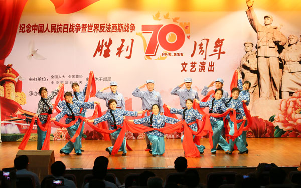 8月27日上午,全国人大常委会办公厅、政协全国委员会办公厅、最高人民法院、最高人民检察院、公安部、国家安全部、司法部等单位离退休干部局在最高人民法院联合举办文艺汇演,纪念中国人民抗日战争暨世界反法西斯战争胜利70周年。最高人民法院院长周强观看演出并致辞。周强指出,伟大的抗战精神是中华民族弥足珍贵的精神财富,全国法院广大干警要深入学习、大力弘扬伟大的抗战精神,坚定理想信念,忠实履行职责,积极投身全面依法治国的伟大实践,为协调推进“四个全面”战略布局,实现中华民族伟大复兴而努力奋斗。