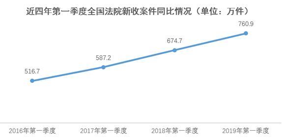 最高人民法院审判管理办公室主任李亮介绍,2019年第一季度,全国法院新收案件760.9万件,同比上升12.78%。其中,广东、江苏、河南3省法院新收案数均超50万件,山东、浙江2省法院新收案数超过40万件,71家法院新收案过万件。