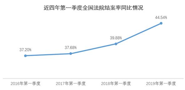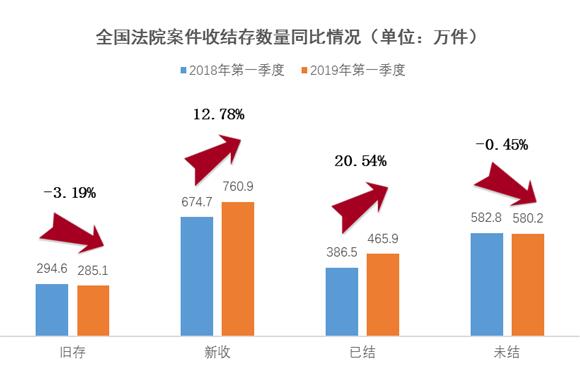 统计数据显示,与去年同期相比,2019年第一季度全国法院新收案件继续保持增长态势,新收各类案件总数同比增加86.2万件,上升12.78%;审执结案件总数增加79.4万件,上升20.54%;结案率上升4.66个百分点;未结案件减少2.6万件,下降0.45%,充分展现了全国各级人民法院深化司法改革、强化审判监督管理、推动信息化建设,狠抓执法办案,推动审判执行工作稳中有进、优质高效发展取得积极成效。