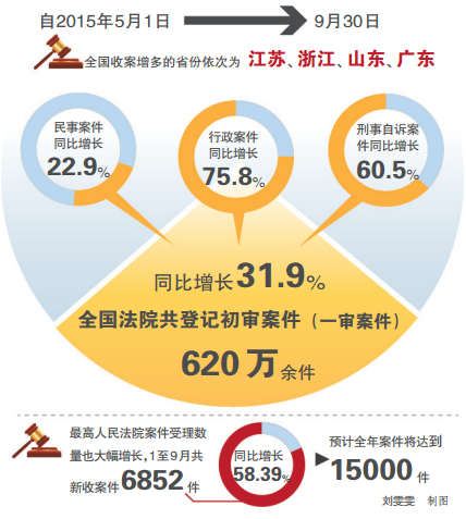 据介绍,自今年5月1日以来,全国法院登记立案渠道畅通,秩序井然,运行平稳。截至9月30日,共登记初审案件(一审案件)620万余件,同比增长31.9%,其中民事案件同比增长22.9%,行政案件同比增长75.8%,刑事自诉案件同比增长60.5%。全国收案增多的省份依次为江苏、浙江、山东和广东。最高人民法院案件受理数量也大幅增长,1至9月共新收案件6852件,同比增长58.39%,预计全年案件将达到15000件。