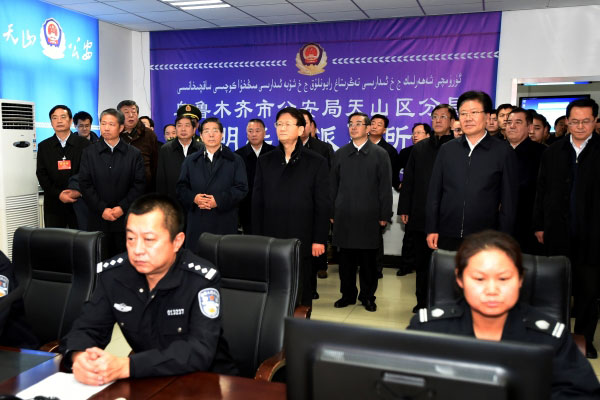 12月11日至12日,中共中央政治局委员、中央政法委书记孟建柱在新疆乌鲁木齐调研。图为孟建柱在天山区明华街派出所考察。郝 帆 摄