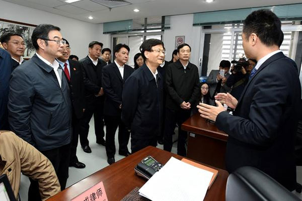 1月13日至16日,中共中央政治局委员、中央政法委书记孟建柱在广东省调研。图为孟建柱来到位于深圳市的最高人民法院第一巡回法庭看望慰问全体法官和工作人员。 摄影 郝帆