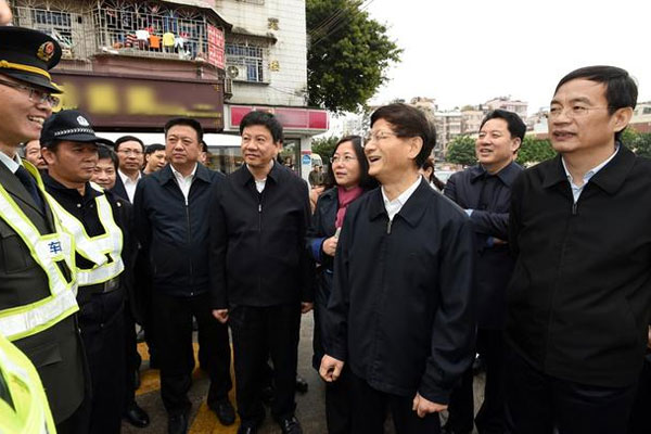 1月13日至16日,中共中央政治局委员、中央政法委书记孟建柱在广东省调研。图为孟建柱实地查看广州市天河区车陂街道城中村治安秩序。 摄影 郝帆