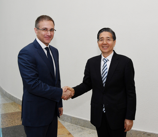6月18日,中共中央政治局委员、中央政法委书记郭声琨在俄罗斯乌法与塞尔维亚副总理兼内务部长斯特法诺维奇会谈。 摄影 郝帆