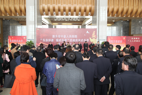 近年来,新乡中院通过布置设立文化墙、法治文化长廊、干警书画长廊、廉政亲情寄语长廊等对干警进行诚信文化教育,倡导诉讼诚信;通过发布失信被执行人名单、“送法六进”、集中办理拖欠农民工工资案件、打击拒不执行法院判决、裁定罪、“倡导诚信见证执行”等活动,严厉打击失信行为,严惩失信行为人;积极探索与银行、税务、工商、公安、铁路等多家部门建立合作机制,建设征信平台等举措,从法院文化建设、审判、执行各个环节,用良知培育诚信、用公正捍卫诚信、用创新推动诚信,大力推进诚信社会建设。