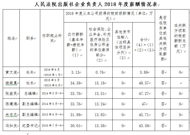 人民法院出版社企业负责人2018年度薪酬情况说明