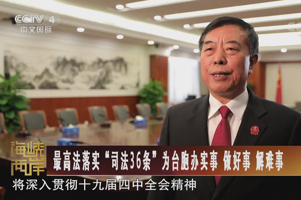 过去一年,人民法院秉持“两岸一家亲”理念,以深化两岸融合发展为主题,以平等保障台湾同胞合法权益为主线,坚持“以审判公平公正赢尊重,以服务便捷高效赢民心”,结合人民法院“两个一站式”建设,为台胞提供快捷多样的纠纷解决渠道和高品质诉讼服务;坚持“以了解增进理解,以交流促进交心”,搭建两岸司法交流合作平台,为广大台湾同胞参与、见证、支持、监督人民司法创造条件,增进了解互信,促进心灵契合;坚持“以制度保证质量,以管理提升效率”,助力涉台司法互助事务提档升级,全年共办理各类司法互助案件7200余件,有效维护了两岸同胞合法权益。推进祖国和平统一进程、完成祖国统一大业,是中华民族伟大复兴的必然要求。中共十九届四中全会将“坚持和完善‘一国两制’制度体系、推进祖国和平统一”作为全党重大战略任务的重要组成部分,意义重大,影响深远。国家强大、民族强盛,是包括台湾同胞在内的每一个中国人生存、发展、尊严的保障;民族复兴、人民幸福,是两岸同胞的共同追求。同胞义重,手足情深。我们相信,在实现中华民族伟大复兴新的历史征程中,台湾同胞定然不会缺席。人民法院将深入学习贯彻十九届四中全会精神,以“36条措施”的进一步推进落实为抓手,全心全意为台湾同胞办实事、做好事、解难事,不断完善促进两岸交流合作、深化两岸融合发展、保障台湾同胞福祉的制度安排和政策措施,与台湾同胞一道,共同致力于民族复兴大业,坚定推进祖国和平统一进程。