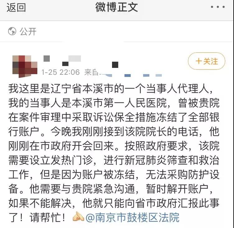 可是就在不久前,法院出于案件审理需要,依法查封了该医院的相关银行账户。因此,代理律师深夜打来电话,希望解封账户。因为,如果该医院的账户无法使用,可能需要向省市政府汇报,将会花费很多时间,延误疫情防控。同时,他还在微博留言希望鼓楼区法院能尽快协调处理。
