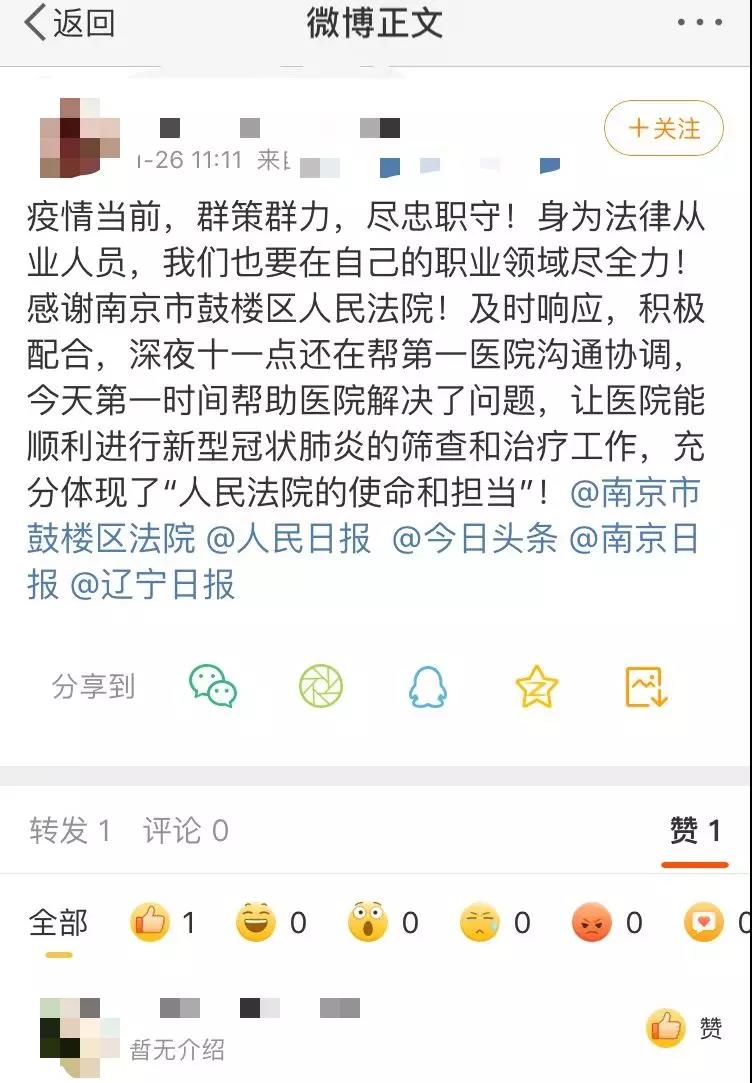 事后,代理人在微博留言:“账户解封后,该医院得以顺利采购设备,进行新冠肺炎的筛查、治疗工作,感谢南京市鼓楼区人民法院,这充分体现了人民法院的使命与担当” !
