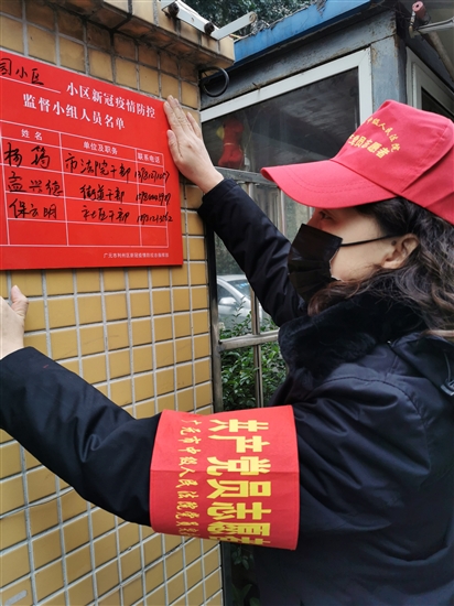 广元法院党员突击队队员在一小区门口张贴责任人员名单。 于小珊 摄