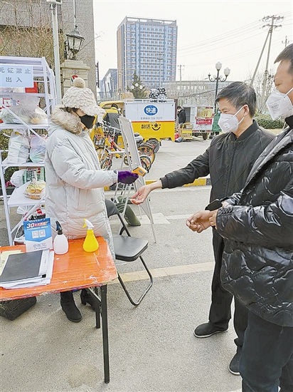 图为马晓秋为回家的小区居民测量体温。 陈安业 摄
