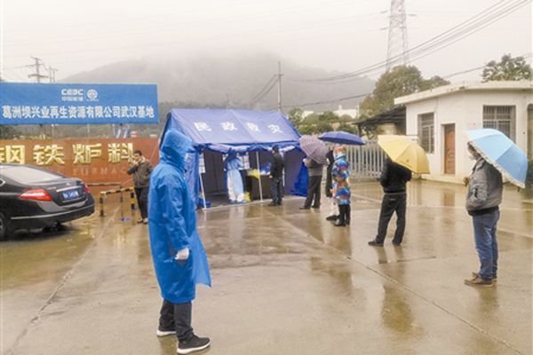图为江夏区法院干警(身穿蓝色雨衣)引导被检测人员拉开间隔、有序排队。 方文博 摄