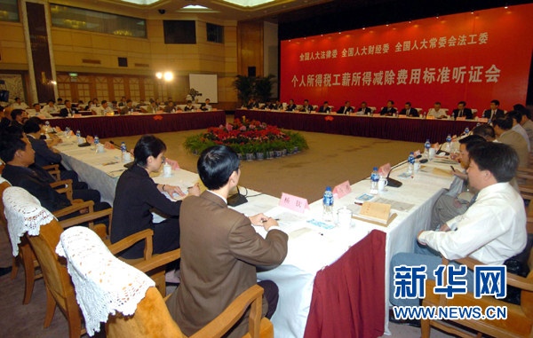 图为2005年9月27日,全国人大法律委、财经委和常委会法工委就修改个人所得税法,联合举行全国人大历史上第一次立法听证会。新华社