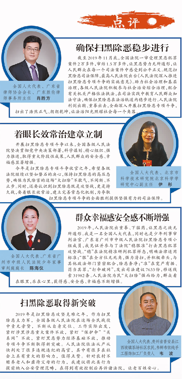 今年,扫黑除恶迈入闯关夺隘、奋勇攻坚的决战阶段,人民法院将继续秉承着一往无前的勇气与决心,在为民除害的“大扫除”中不歇气、不间断、不止步,为决胜全面建成小康社会“扫”出一片清朗乾坤。(记者 雷蕾)