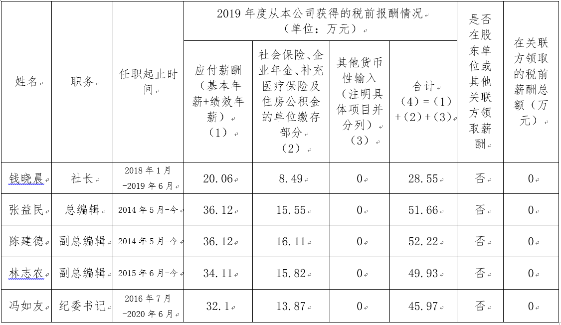 现根据批复内容,按照人力资源社会保障部历年关于中央企业负责人薪酬审核工作的相关要求,披露出版社企业负责人2019年度薪酬情况,具体如下: