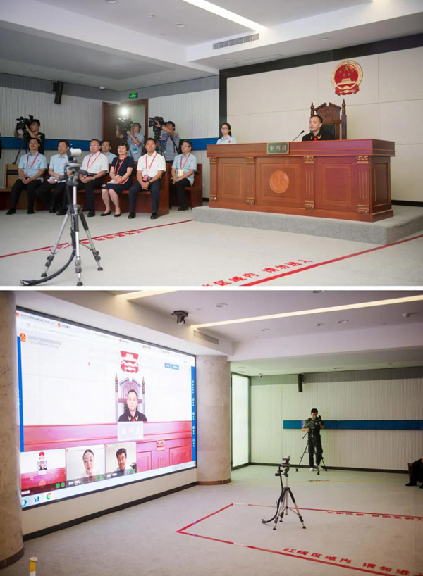 广州互联网法院法官正运用“YUE法庭”进行庭审