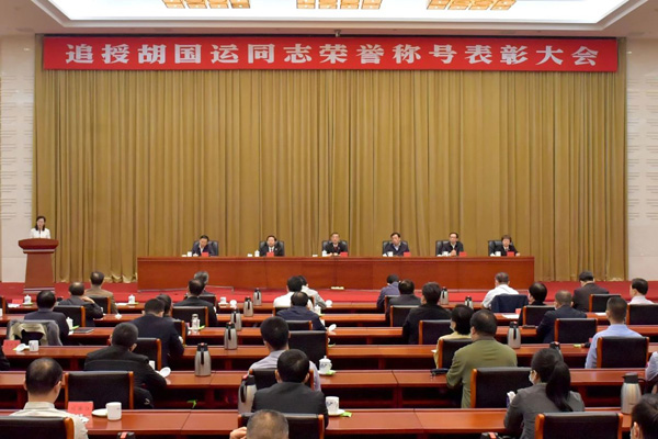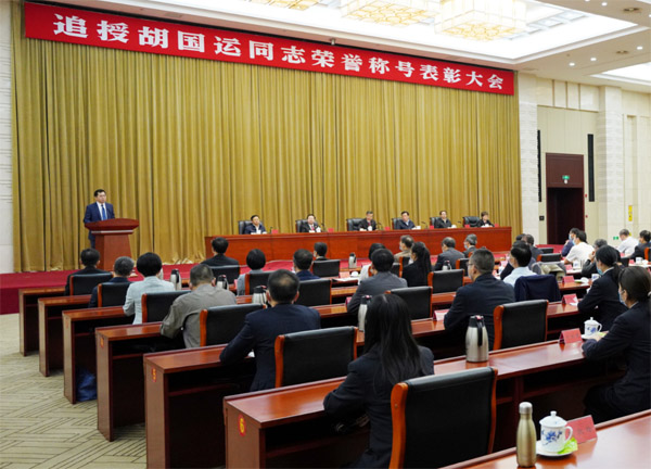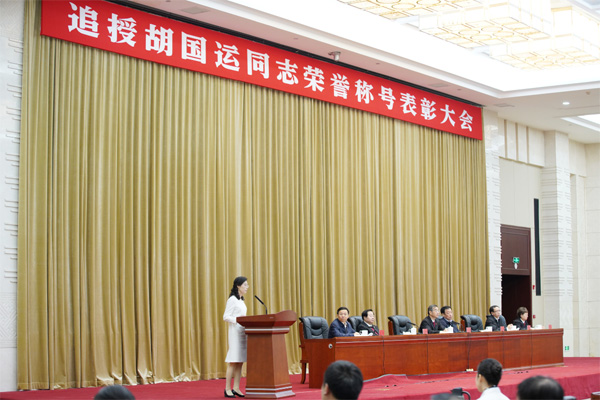 8时,雄壮的国歌声中,表彰大会正式开始。最高人民法院党组成员、政治部主任马世忠宣读人力资源社会保障部、最高人民法院《关于追授胡国运同志“全国模范法官”称号的决定》,中共江西省委常委、省委组织部部长刘强宣读中共江西省委《关于追授胡国运同志“全省优秀共产党员”称号的决定》。