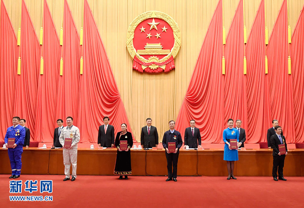 在欢快的乐曲声中,全国劳动模范和先进工作者代表依次登上主席台,习近平等为他们颁发荣誉证书。