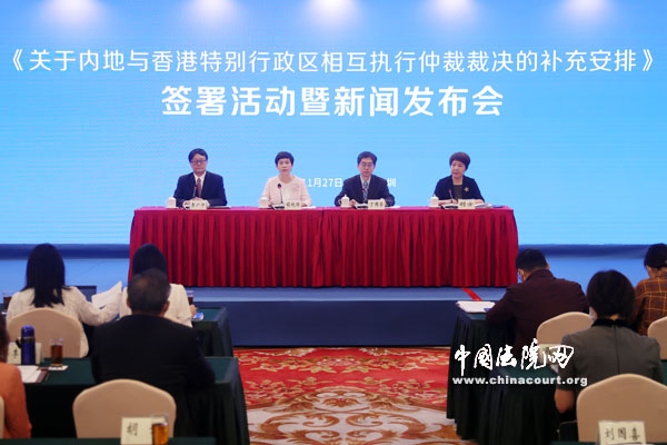 最高人民法院副院长杨万明与香港特区政府律政司司长郑若骅分别代表两地签署《关于内地与香港特别行政区相互执行仲裁裁决的补充安排》。