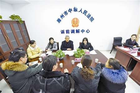 1月7日,滁州中院诉前调解中心,3位调解员正调解17起KTV侵权纠纷。 周瑞平 摄
