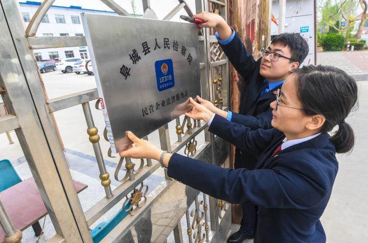 2019年4月23日,河北省阜城县人民检察院检察官在一家企业门口挂“民营企业法律服务站”的牌子,为经济发展履行保驾护航职责。新华社记者李晓果摄