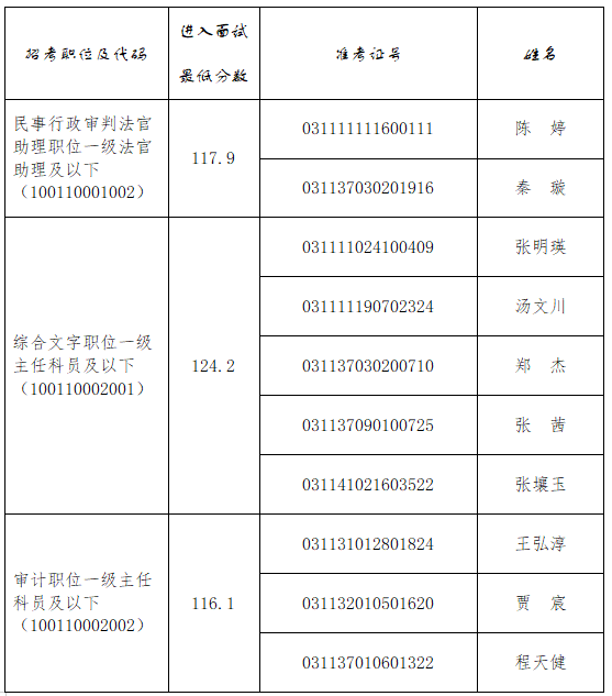 因部分考生放弃面试资格,根据公务员考录有关规定,在公共科目笔试合格的考生中,按照笔试成绩由高到低依次递补部分考生进入面试,名单如下(按准考证号排序):