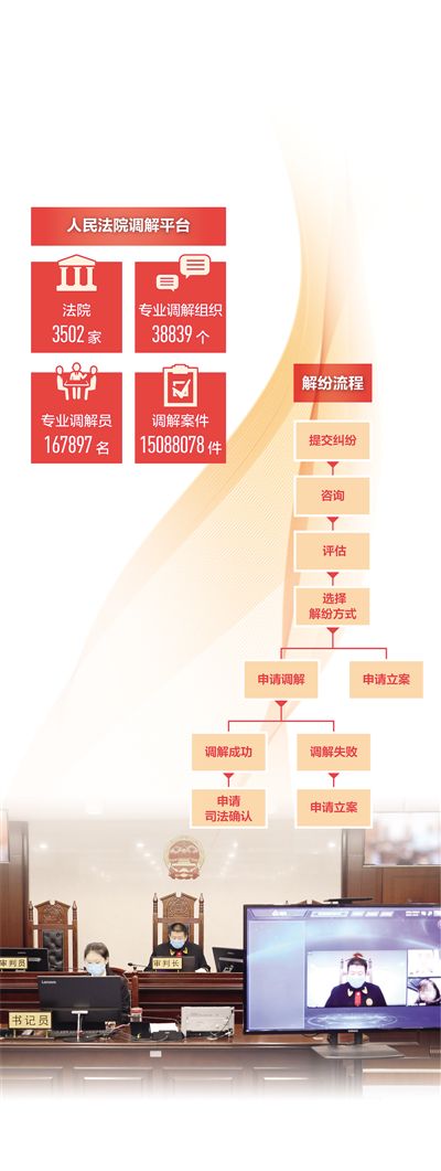这是记者近日从最高人民法院新闻发布会上获悉的。发布会上,最高法联合全国总工会、中国侨联、国家发改委、人民银行、银保监会、国家知识产权局共同发布人民法院调解平台应用成效以及《中国法院的多元化纠纷解决机制改革报告(2015—2020)》。