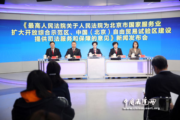 发布内容:发布《最高人民法院关于人民法院为北京市国家服务业扩大开放综合示范区、中国(北京)自由贸易试验区建设提供司法服务和保障的意见》并回答记者提问。