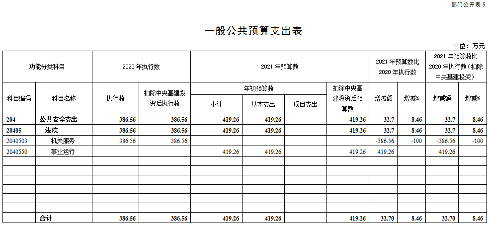 2.公共安全支出(类)法院(款)事业运行(项)2021年预算数为419.26万元,比2020年执行数增加419.26万元,主要原因是:机关服务(项)相关支出调整科目所导致。