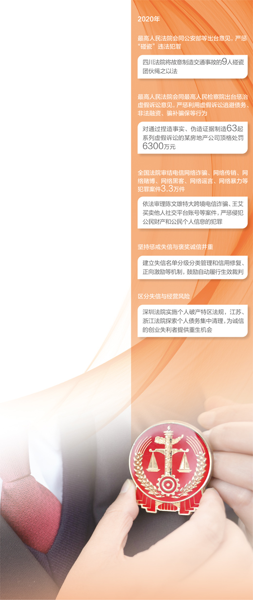 从严惩“碰瓷”行为到惩治“虚假诉讼”;从治理网络欺诈到打击制假售假;从惩戒“老赖”逃债到鼓励修复诚信……近年来,人民法院充分发挥审判执行职能作用,弘扬“有约必践”,保护“货真价实”,严惩“坑蒙拐骗”,用公正司法助力诚信建设。