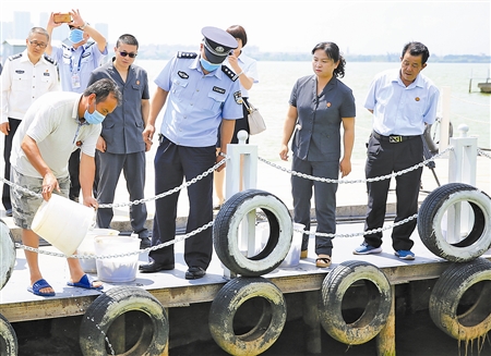 2020年6月1日,云南省安宁市人民法院在滇池水警码头审理一起非法捕捞案。图为当庭宣判后,被告人赵某向滇池增殖放流鱼苗。杨 帆 摄