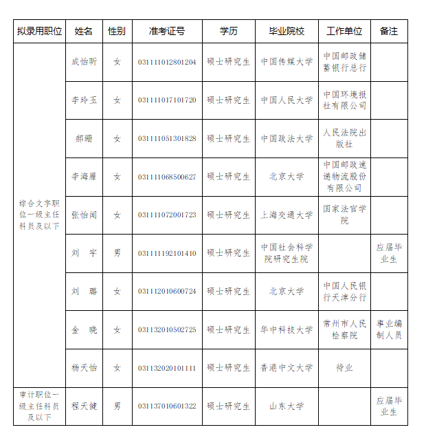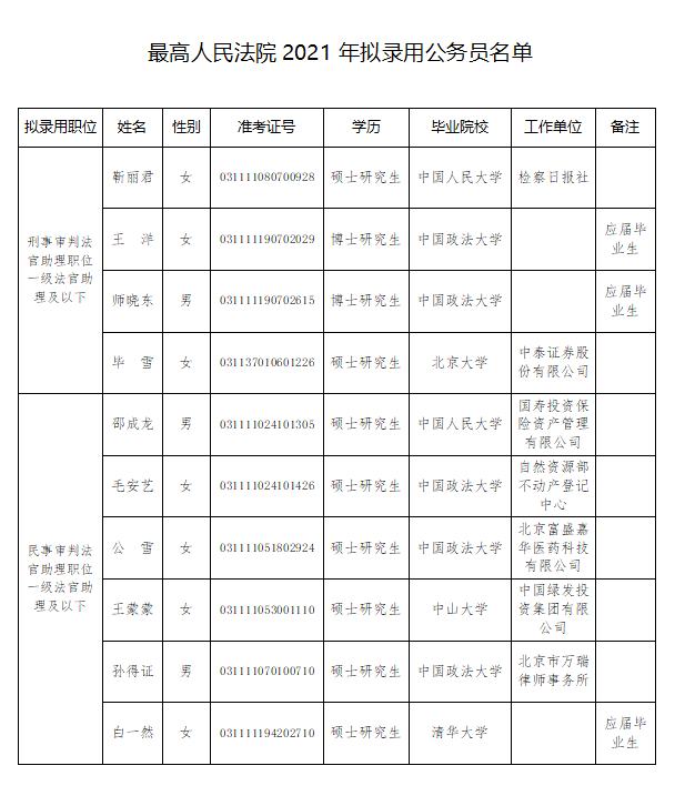 最高人民法院2021年公务员招录工作拟录用人员公示公告