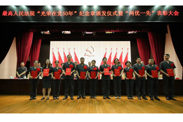 上午,最高人民法院中法庭洋溢着喜庆氛围,38位加入中国共产党满50年的最高人民法院老党员聚集一堂,共迎党的百年华诞。周强为他们颁发“光荣在党50年”纪念章,向大家致以亲切问候和崇高敬意。周强表示,人民司法事业的发展进步离不开老党员、老同志的辛勤付出、无私奉献,希望各位老党员、老同志继续发挥政治优势、经验优势、威望优势,影响带动法院党员干部和年轻一代,把人民司法光荣传统不断发扬光大。