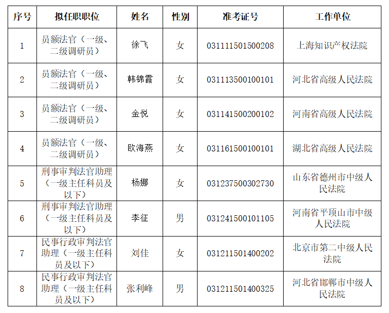 最高人民法院2021年度公务员公开遴选拟任职人员名单