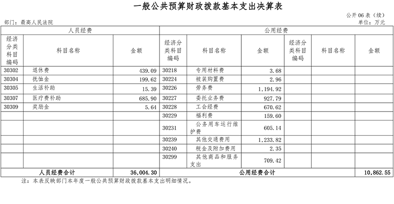 最高人民法院2020年度一般公共预算财政拨款基本支出46,866.85万元,其中:人员经费36,004.3万元,主要包括基本工资、津贴补贴、奖金、伙食补助费、绩效工资、机关事业单位基本养老保险缴费、职业年金缴费、其他社会保障缴费、住房公积金、医疗费、其他工资福利支出、离休费、退休费、抚恤金、生活补助、医疗费补助、奖励金;公用经费10,862.55万元,主要包括办公费、印刷费、水费、电费、邮电费、取暖费、物业管理费、差旅费、维修(护)费、租赁费、会议费、培训费、公务接待费、专用材料费、被装购置费、劳务费、委托业务费、工会经费、福利费、公务用车运行维护费、其他交通费用、税金及附加费用、其他商品和服务支出、办公设备购置、专用设备购置、信息网络及软件购置更新、公务用车购置。