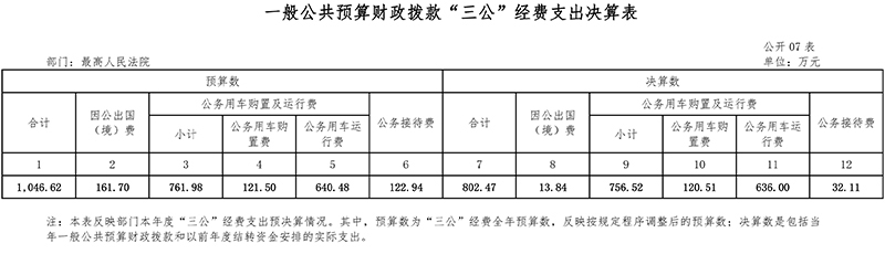 (十七)“三公”经费:纳入最高人民法院预决算管理的“三公”经费,是指最高人民法院用财政拨款安排的因公出国(境)费、公务用车购置及运行费和公务接待费。其中,因公出国(境)费反映的是最高人民法院工作人员公务出国(境)的国际旅费、国外城市间交通费、住宿费、伙食费、培训费、公杂费等支出;公务用车购置及运行费反映最高人民法院公务用车购置支出(含车辆购置税)及燃料费、维修费、过路过桥费、保险费、安全奖励费用等支出;公务接待费反映最高人民法院按规定开支的各类公务接待(含外宾接待)支出。