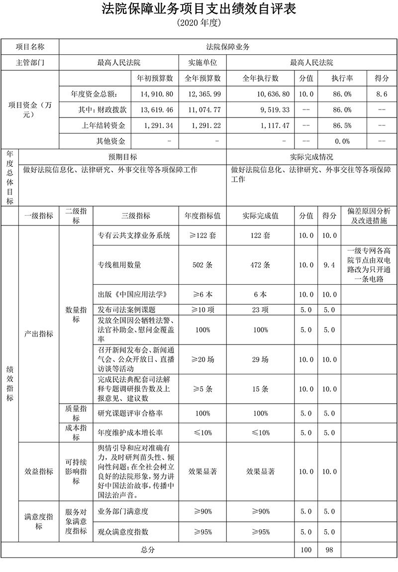 (2)法院保障业务项目绩效自评综述:根据年初设定的绩效目标,项目自评得分为98分。全年预算数为12,365.99万元,执行数为10,636.8万元,完成预算的86%。项目绩效目标完成情况:法院保障业务项目用于保障做好法院信息化、法律研究、外事交往等各项保障工作,项目设置绩效指标12项,包括产出指标9项、效益指标1项和满意度指标2项,其中11项指标达到设定的年度指标值。发现的主要问题及原因:专线租用数量1项产出(数量)指标未完成,主要是一级专网预算限制,各高院节点由双电路改为只开通一条电路。下一步改进措施:根据实际需求和预算安排情况调整设定的绩效指标。