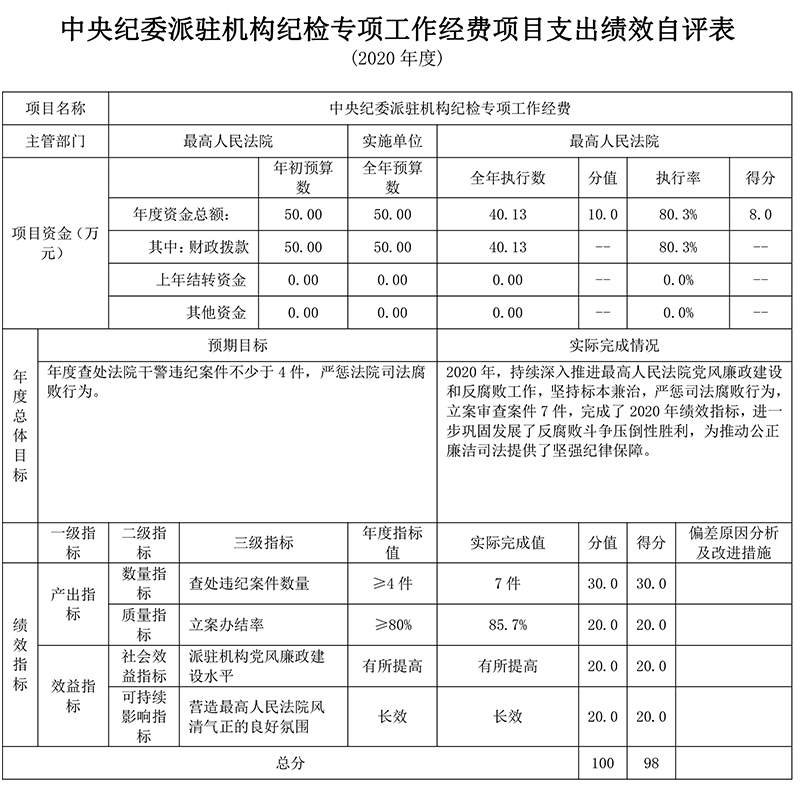 (4)中央纪委派驻机构纪检专项工作经费项目绩效自评综述:根据年初设定的绩效目标,项目自评得分为98分。项目全年预算合计50万元,执行数为40.13万元,完成预算的80.3%。项目绩效目标完成情况:中央纪委派驻机构纪检专项工作经费项目用于持续深入推进最高人民法院党风廉政建设和反腐败工作,坚持标本兼治,严惩司法腐败行为,2020年立案审查案件7件,进一步巩固发展了反腐败斗争压倒性胜利,为推动公正廉洁司法提供了坚强纪律保障。项目设置绩效指标4项,包括产出指标2项、效益指标2项,各项指标均达到设定的年度指标值。发现的主要问题及原因:无。下一步改进措施:无。