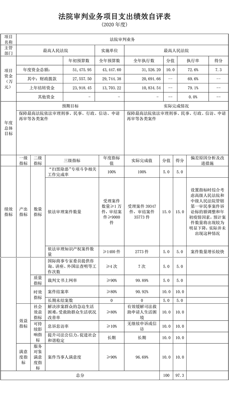 (1)法院审判业务项目绩效自评综述:根据年初设定的绩效目标,项目自评得分为97.3分。全年预算数为43,447.6万元,执行数为31,526.2万元,完成预算的72.6%。项目绩效目标完成情况:法院审判业务项目保障最高法院依法审理刑事、民事、行政、信访、申请再审等各类案件,项目设置绩效指标11项,包括产出指标7项、效益指标3项和满意度指标1项,各项指标均达到设定的年度指标值。发现的主要问题及原因:依法审理案件数量实际完成值高于年初绩效目标值幅度较大,主要是在设置指标时综合考虑高级人民法院和中级人民法院管辖第一审民事案件诉讼标的额调整和年初疫情因素,预计案件数量将出现较为明显的下降,实际并未出现这种情况。下一步改进措施:更好地分析研判案件数量变化趋势,科学设置绩效指标。